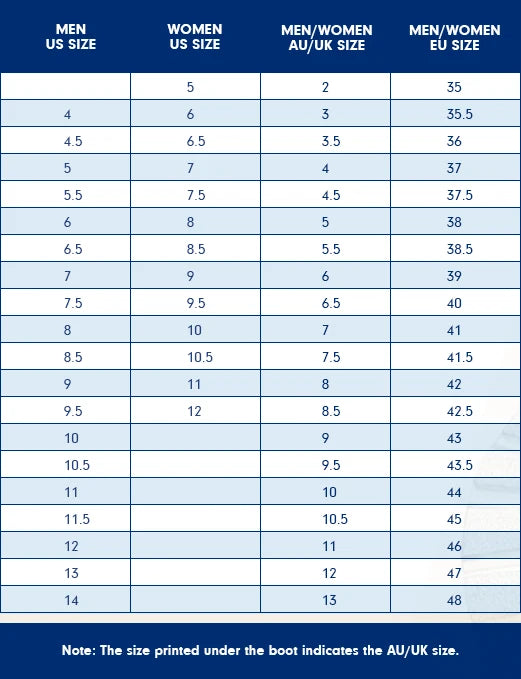 - Please note all sizing is listed as AU. Please refer to the size chart below to find your correct US Size. All boots are unisex
